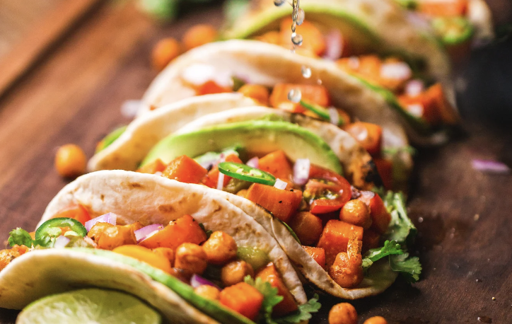• Arrange your cooked fish, roasted vegetables, avocado and sauce onto your tortilla.