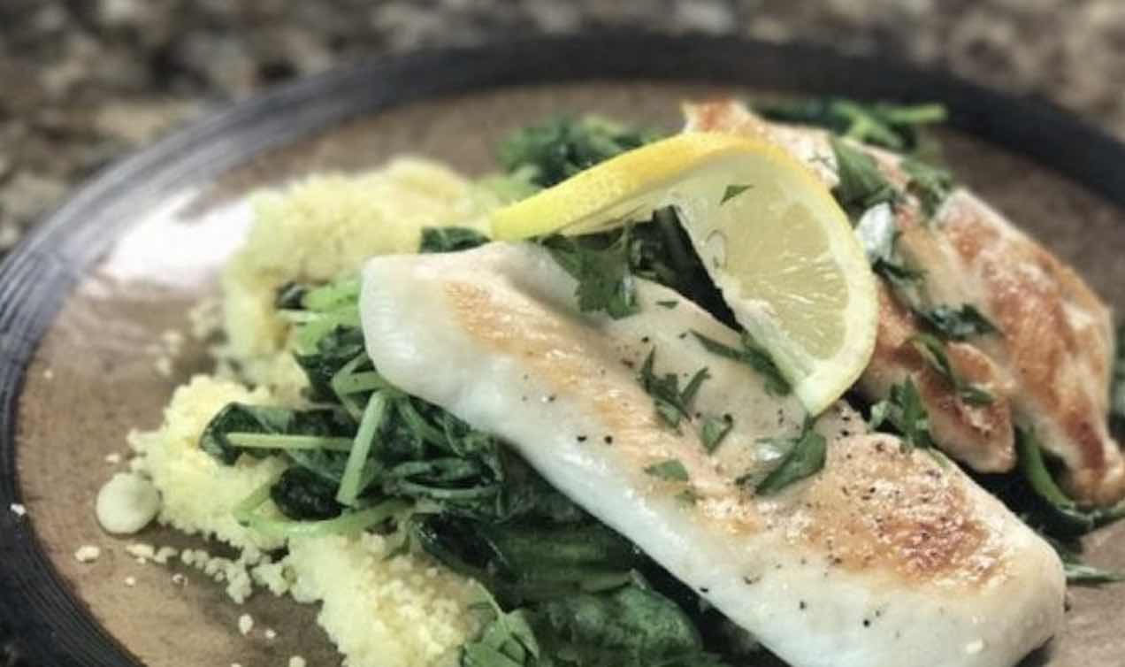 - Place couscous on plate, top with wilted greens and top with chicken. Top with parsley and lemon wedge.
