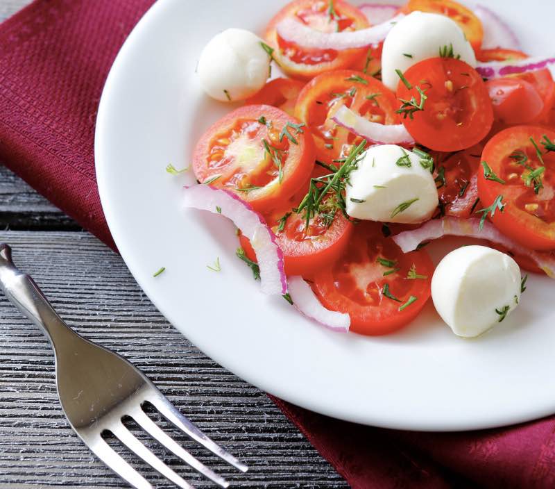 • Cover tomatoes with onions, mozzarella, basil. Drizzle with vinegar and oil. Add salt and pepper to taste.